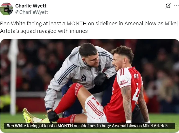 报道称,怀特在周日接受了扫描,结果显示他将缺阵4-5周。