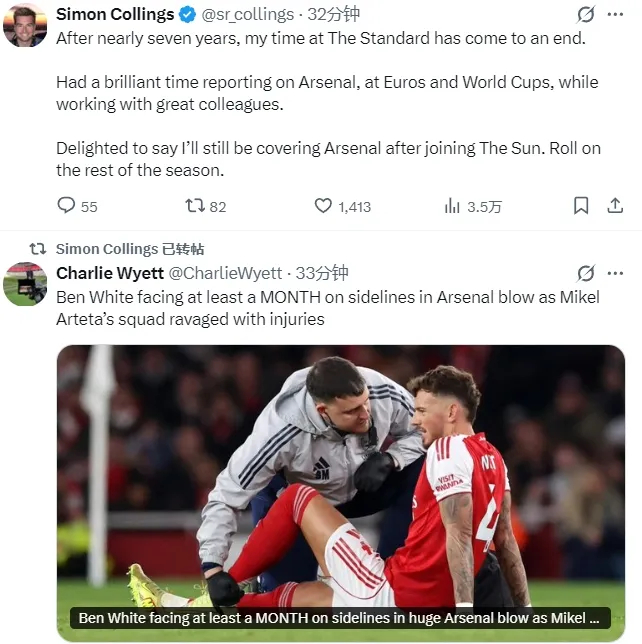 伦敦晚旗报阿森纳方面记者SC发推确认,他已经从晚旗报跳槽到了太阳报,并且未来仍将报道阿森纳的新闻。